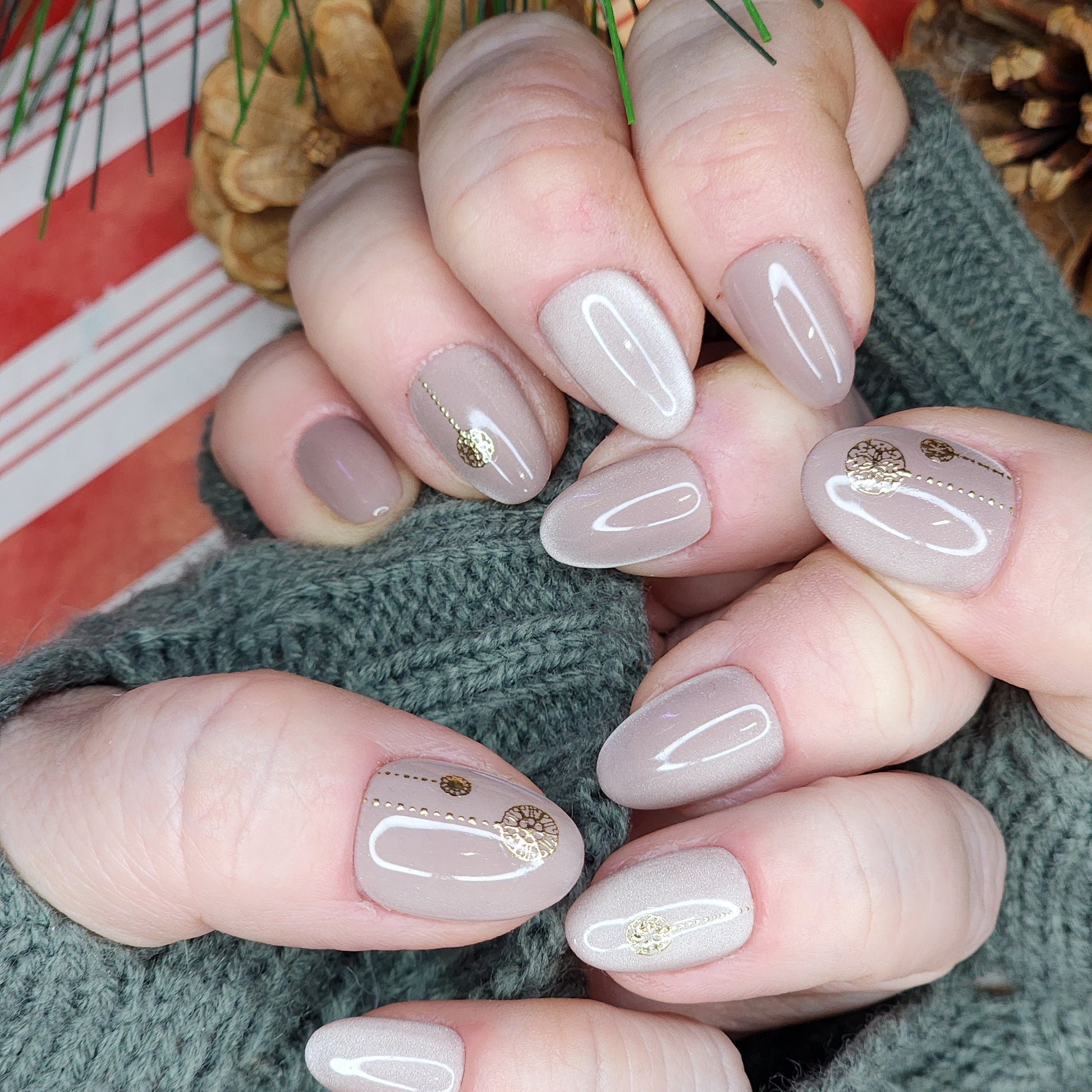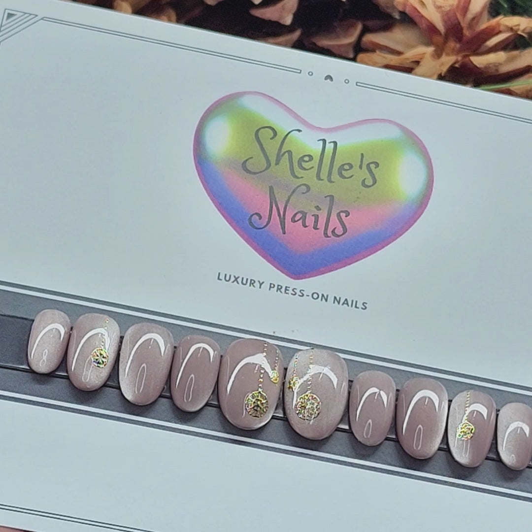 Luxury Holiday nails ready for the party. This set showcases luxe gold ornaments on select accent nails, adding a touch of opulence and making your hands the center of attention. The remaining nails showcase a mesmerizing neutral-tone cat-eye effect, radiating understated glamour that catches the light beautifully